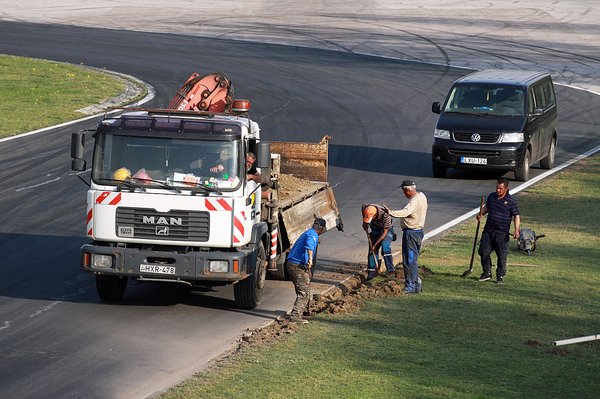 De hétfőn már délután 3-kor vége is volt mindennek, mert a 2-es kanyar előtti féktávon leszakadt a pálya jobb széle. Piros zászló, piros lámpa, síri csend. Majd kijött az útépítőbrigád két furgonnal és egy teherautóval, majd nekiálltak javításnak. Felexelés, betonozás, aszfaltozás, festés. De jó lenne, ha a mi utcánkban is ilyen fürgén menne.