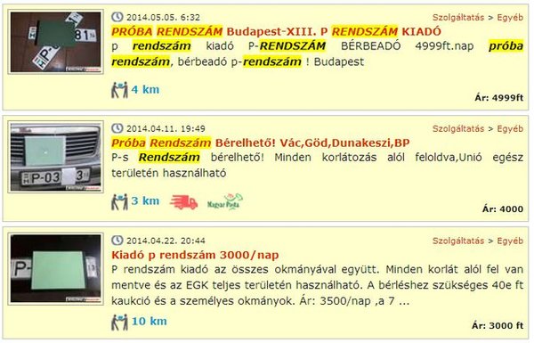 Mivel a jelek szerint a rendszámcsaló kereskedők is olvasnak Totalcart, hirtelen csak három olyan apróhirdetést találtam a neten, amelyben próbarendszámot kínálnak eladásra. Nyolcvan-száztízezer forintot kérnek értük, és a hirdetések ugyanúgy a racing bazáron voltak tegnap este, mint a korábbi cikkben szereplő példák. Egy üzletág tartja még igazán magát, a bérbeadás, mely szintén illegális. A bérleti díj napi 3-5 ezer forint, az ügyfél megbízási szerződést kap a cégtől, mintha ő is ott dolgozna, és azért használná a próbarendszámot a kifizetett időszakban.