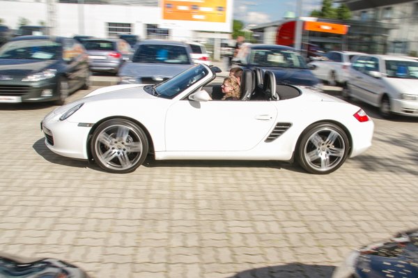 Szerettem volna, ha a tesztalanyunk beül valami sportos kisautóba is, például egy Mazda MX-5-be, vagy Audi TT-be. Sajnos egyik sem volt a telepen, ezért kénytelenek voltunk a Porschét választani, de Virág elvtárs óta tudjuk, hogy az élet nem habostorta. Sokat vártam az autótól, mert a 182 centimmel le kellett hajolnom, hogy kinyissam az ajtót, vagyis alacsony, lenyitott tetővel pedig a dimenzióit is könnyebb felmérni. Végül pont a felépítése lett a veszte, ugyanis teljesen előretolt és felemelt üléssel is csak kecmeregve látott át a műszerfal felett. Legalább a kormányt lejjebb lehetett állítani. Zsófi még arra is panaszkodott, hogy a teljesen előretolt üléssel épp hogy ki bírja nyomni a pedálokat, ami egy keményebb kuplungú autónál bizony probléma. Remélem sosem lesz nagyobb gondja az életben, minthogy nehézkesen lát ki egy Porsche Boxsterből.