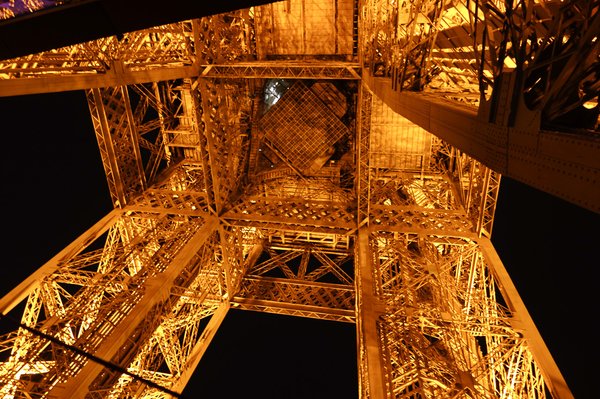 Most a Peugeot pénztárcája repített fel az íves pályán közlekedő lift hátán a magasba, igaz, csak az elsőre, és az étteremből nézhettem végig az alkonyatot Párizs felett. Kevés az olyan városi hely a világon, ahol ilyen masszívan szívbe markoló gyönyörűség lenne egy májusi naplemente. A vacsoránál egy ír kartárssal (így mondták régen...) ültem egy asztalnál, a világ összes témáját elővettük, jót pofáztunk, de minduntalan elbambultam, mert ahogy a torony belseje felé néztem, egyszer csak felgyújtották a világítást a szerkezeten, és a sötét ultramarinkék ég előtt a két, íves lábszerkezetből kibontakozó két toronyláb olyanná vált, mintha ragyogó színaranyból öntötték volna. Tényleg elmondhatatlan, de azért készítettem egy képet róla.
