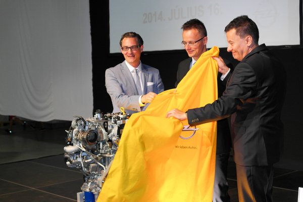 Szokatlan módon csak a gyár megtekintése után vette kezdetét a hivatalos protokoll-ceremónia, Solt Tamás igazgatóval, Joachim Koschnicke GM-alelnökkel és Szíjjártó Péterrel, aki mostanában a kormány hivatalos átadó-embere, a múlt heti ünnepség óta minimum három másik üzemet adott át, noha csak elvétve nézek híradót. Ő egyébként hivatalosan a külgazdasági és külügyminisztérium parlamenti államtitkára, de valamiért végig miniszterhelyettes úrnak szólították, ez szemmel láthatóan nem zavarta.
