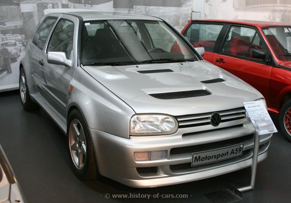 Sokan a II-est tartják az utolsó igazán markáns Golfnak, és igaz ez a műszaki megoldásokra is. Rengeteg olyan alkatrészt használtak, amelyek modellváltozatonként egyediek voltak, ez ugyan szép mérnöki virtus, csak épp nem lehet vele megfogni a pénzt. Kár lenne azonban azt hinni, hogy a III-as Golfból már nem készült igazán mérges változat, csak az A59 lényegesen ritkább, mint a fehér holló. 1992-ben indult a fejlesztés, és két év múlva készült el az A és N-csoportba szánt versenygépek prototípusa. A munka érdemi részét a VW kiszervezte a Schmidt Motorsporthoz. A motort alapjaiban tervezték újra, Haldexhez hasonló összkerékhajtást építettek be, és az egész gépet a várható versenypályás használathoz méretezték. 2500 homologizációs darab volt tervben, ebből kettő készült el, azok is a gyár múzeumában, kordonok mögött végezték. A 275 lóerő mai szemmel nem tűnhet soknak, de mivel egy versenyzésre szánt turbómotorról van szó, ezt a számot illik rugalmasan kezelni, a mérnökök szerint 400 lóerő még változtatások nélkül, üzembiztosan kihozható volt belőle.