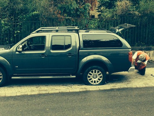 Kihívta a Nissan Assistance-t, csinálják meg ők a kerékcserét. Kiderült, hogy a felni akkora ütést kapott, hogy a kerékcsavarokat nem lehet kilazítani, így nem lehetett leszerelni a kereket. A kocsit végül a zuglói Nissan Gablini szervizbe szállították trélerrel.