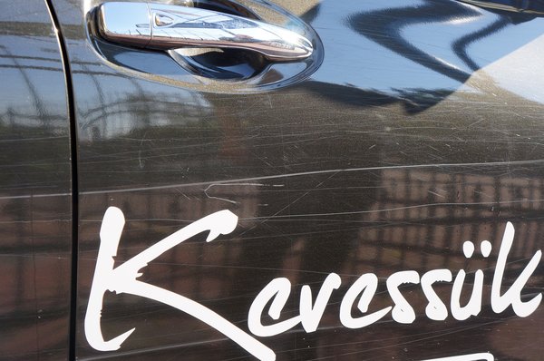 Ahogy a szivacsos samponozás után tiszta vízzel kezdték öblíteni a bódét, az egész autó egyetlen nagy vonalas füzetté vált a mindenféle mélységű és hosszúságú karcoktól. A matricák alatt is csíkos volt, bár kevésbé. Az orra sértetlen, csupán a két fényszóró környékén kezdődnek a vonalak, a farán semmit nem látni. Jó pont, hogy a küszöbök alján műanyagborítás fut végig, vagyis itt nem tudtuk leverni a keréknyomokban haladva a festést.
