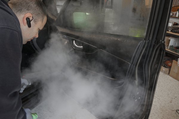 A gőzborotvát bátran használták az autó egyéb részein is. Elsősorban az ajtók és a csomagtérajtó műanyagborításán, és az ajtóközökben, illetve a küszöbökön, mert a gőzölős módszer mindenhol működik. A kemény felületeken ezután kis kárpittisztós vízzel átitatott mikroszálas törlővel mentek végig, ami lehozta a feloldott szennyeződések nagyját. A gőzöléstől nem lesz csurom vizes semmi, ezért például az ajtókban lévő elektromos ablakemelő-kapcsolók sem áztak be, viszont a hatás, a pamutpelenkás áttörölgetés után nem maradt el: a műanyagok tökéletesen tiszták lettek, a módszer működött az ablakok esetén is.