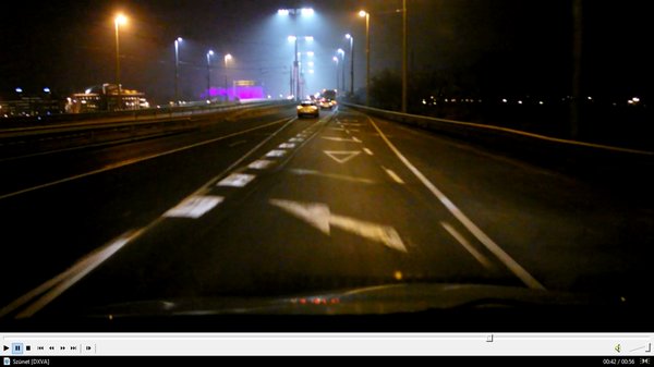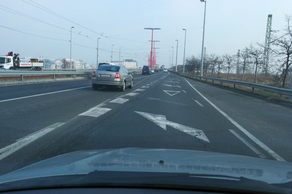 Még szerencse, hogy viszonylag kis forgalmú helyről van szó, ez a Lágymányosi híd budai felhajtója, ahol este a villamospálya-építés összes ideiglenes felfestése előtűnik. Nappal jobb a helyzet, de azért ezen nem ártana javítani.