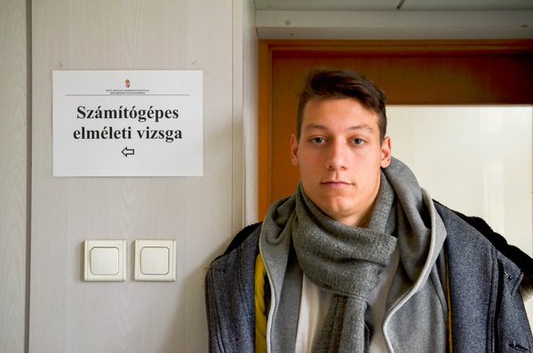 Negyedik napja él az új rendszer, akik most a teremben várnak, még mind abban a tudatban kezdték különféle közlekedési ismeret képzéseiket tavaly, hogy a régi rendszerben vizsgáznak. Így járt Tibi is, aki fülhallgatójához menekül a vizsgadrukkból, mielőtt letámadom. Ezen a pénteken három délelőtti időpontra jönnek a vizsgázók, ő a másodikba vár, A2-kategóriára jött. Szerdán már járt itt, akkor négy ponttal bukta el a B-s viszgát. Huszonegy éves, válogatott kajakos. A szerződése tiltja a veszélyes sportokat, az életében sokáig a motorozás is annak számított, de úgy érzi, megérett rá. Kismotorra már van jogsija, de egy régi bukás hosszú időre elvette a kedvét. A jobb csuklójával és bal kulcscsontjával akkor kis híjján sportkarrierje is összetört, de fél év után folytathatta.