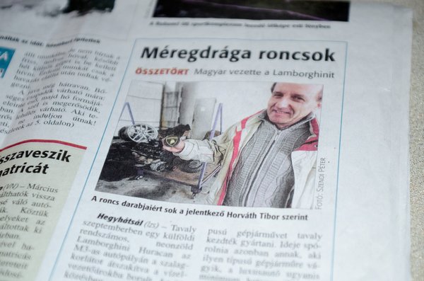 Ezt én ki tudnám vonatni – mondta Tibor a marcali kollégának, amikor meglátta a tréleren álló égett fémkupacot. Olvasott az M7-esen történt balesetről, tudta, hogy valami érdekeset talált, bár a Huracan, mint típus nem volt ismerős. Érezte, sok jó kisülhet még abból, ha hozzá kerül a kormos roncs. Az autómentős kolléga megígérte, hogy őt ajánlja majd, ha a tulajdonos megkéri, intézze el a szomorú véggel járó papírmunkát. Így is tett.