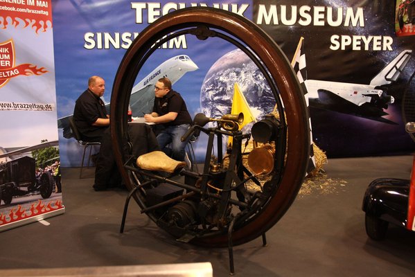 150 köbcentis, egyhengeres, 3,5 lóerős motor hajtotta – ekkora teljesítmény egy százhuszonegy évvel ezelőtt géptől merőben szokatlan, nem mernék megesküdni rá, hogy ma is éppolyan motor hajtja ezt az utánzatot, mint az eredetit anno. Mindenesetre elképzelni is rossz, mi lett volna, ha ezek a 150 kilós, 1,7 méteres átmérőjű steampunk rettenetek elterjednek a világban – mert például fékezni egyáltalán nem lehetett az ilyennel, hiszen erős lassításra a motorizált óriáskerék a vezetővel együtt átfordult a fején.