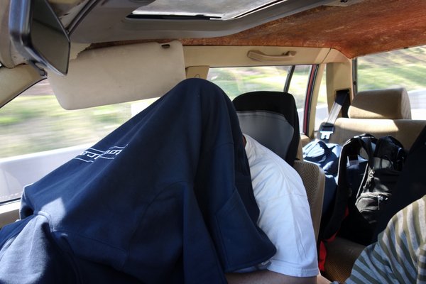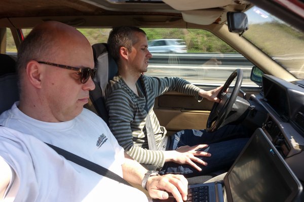 A Volvo hatalmas ablakai azonban kellemetlen tényezővé váltak kivételesen. Előző éjjel kiesett a penna a kezemből, amikor meg kellett volna írnom az aznapi esseni riportot, amikor már vagy huszadszor elaludtam a gép fölött, feladtam. Ezért Dani vette át a volánt (nem titkolt örömmel), én ültem át jobb egybe, dolgozni. A nap azonban úgy sütött, hogy a HP notebookom kijelzőjéből szinte semmit se láttam, borzalmas kínszenvedés volt képeket válogatni, ellenőrizni, amit írtam. Ötletem támadt, bebújtam a kapucnis pulcsi alá – meleg lett, de legalább sötét is, be tudtam fejezni a cikket, ami olyan hosszú lett végül, hogy első adagban csak a felét tettük ki a Totalcarra.