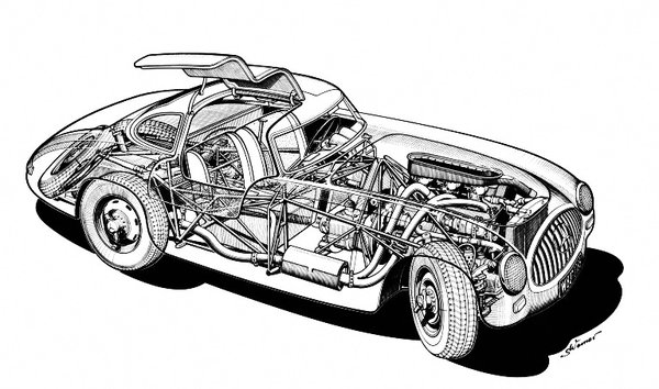 Az ötletet tettek követték, Uhlenhaut vezénylésével 1952. március 12-ére készen állt a csővázas (ennek tömege csupán 50 kg volt), 0,25 alaktényezőjű, a magasan húzódó csőrendszer miatt felfelé nyíló ajtós 300SL. Ennyi volt benne a különleges alkatrész, mert a háromliteres, soros hathengeres motor (itt három Solex karburátor alkalmazásával 115-ről 175 lóerősre izmosítva), a négyfokozatú váltó, az elöl kettős keresztlengőkaros, hátul lengőtengelyes futómű, a fékek (kicsit szélesebb pofákkal) a 300-as limuzinból jöttek.