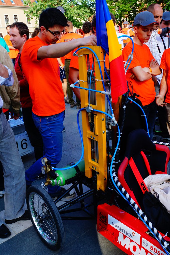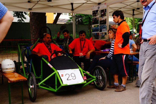A legtöbb csapat arra törekszik, hogy egy-egy versenyszámban érjen el sikert, így ki a gyorsulás, ki az ügyességi, ki pedig a hosszú távú futamra hegyezi ki a gépet. Az Nagyváradi Egyetem egyik csapatának zöld autója üti meg a szemünket, hiszen egy igazán masszív csővázra építkeztek, elsőre talán túlzásnak is tűnik.