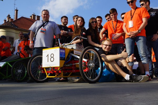 Miközben gépelek, a Kecskeméti Főiskola csapata tolja vissza háromkerekűjét a murván át, pedig nagyon nem ott kéne. Nóri, a pilóta igazán keményen ment, az ügyességi futamon többször driftelt, de a kivetítőn olyat is lehetett látni, hogy egy kerék sem ért a földre. A Jok-Air idén először indul, a baleset előtt a második legjobb időt futották, de most megadta magát a kormánymű, mintha a csonkállvány tört volna el.
