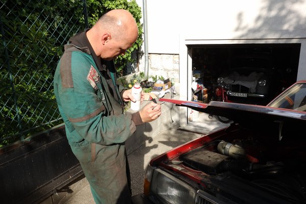 Súlyos homályban borítottam a motorra a takarót, a motorházfedélre és a tetőre a függönyt, nyomtam az élére padlógázon a pirosat. Azért sötétben ez nem olyan vicces, alig láttam, mit csinálok (az illusztráló képen sokat világosítottunk, hogy legalább az olvasók lássák). A végén még toltam a köténylemezre is belőle, aztán a pisztolyt már a garázs világításában mostam el. Pirosat fújva, köpve, köhögve, piros szegélyes kezekkel tértem meg kicsiny családomhoz – nem is értettem, miért húzódik el tőlem mindenki. Aztán a Norbi elárulta – apa, olyan furcsa szagod van...