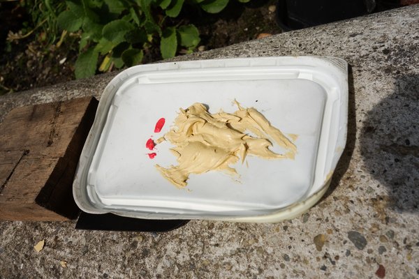 Utálom, sőt, szívből gyűlölöm ezt az anyagot, sosem tudtam bánni vele. Ott kezdődik, hogy egy hatalmas adag cucchoz három százaléknyi edzőt kell tenni – jelentkezzen, kinek van ilyen adagoláshoz szemmértéke? Ha túl keveset teszel bele a rózsaszínből, sose köt meg, ha kicsit többet, a harmadik kenésnél csomósodni kezd, tönkretéve, amit addig felvittél. Akkor is baj van, ha azt a hangyafasznyi rózsaszín edzőt nem kevered el tökéletesen a sok-sok tömőanyaggal, ezért aki olyan aggódós, mint én, az hajlamos alkalmatlan keverőtálban (Rama-fedél), alkalmatlan eszközzel (rossz csavarhúzó), olyan soká kevergetni, hogy már ott, felhordás előtt elkezd megkötni. Pfujjjj.