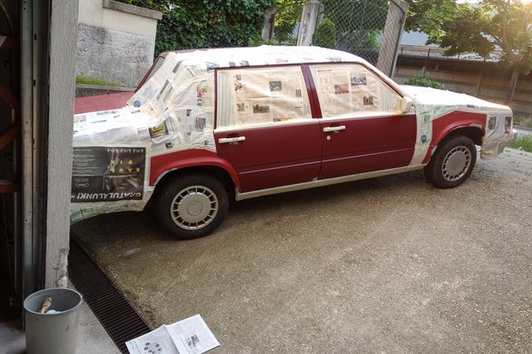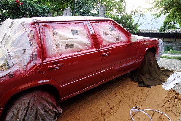 Igazából már rég neki akartam állni az ajtók lefújásának, de nehezen vettem rá magam, ez egy olyan terep, amire ritkán merészkedek. Amikor régebben az autóimat festettem, azt az elmúlt közel harminc évben szinte mindig szprével, esetleg ecsettel végeztem, s amikor mégis fújtam autót, akkor is valami kölcsönkapott, svájci, rezgőnyelves borzalommal köpködtem telibe például a kék Puchomat a Pálos utca parkolójában. Kompresszorral/pisztollyal csak a Karesznál festettem, kicsiket, amikor ő épp mást művelt, de olyankor ő keverte a festéket, a levegőt, állította be a pisztolyt. És úgy se lett szép a végeredmény. Most én csinálok mindent, előkészítéstől a Lidl-es festékpisztoly felavatásán át, a beállításán keresztül az elpucolásig.