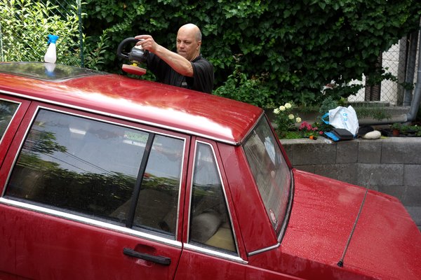Mintha darázsraj kergetett volna, megcsináltam a kocsi elejét és a bal oldali ajtókat, mert mint mondtam, jött erősen a nap. Már rajta voltak az első sugarak a fényszórókon, amikor beizzítottam a Makitát, őrült tempóban spricceltem a vizet, már húztam is a gépet. Ahogy kész voltam, mentem neki az ajtók aljának, meglepő, de egészen simának tűnt a felület. Hasonló brutál tempóban estem neki a tetőnek, de itt már remegett a kezem, hiába, nem vagyok edzésben. A kemény vízpapírozás, a spricni rángatása vagy ezerszer, a víz ki-be hordása (aztán inkább kihoztam a slagot), a nehéz gép kordában tartása nem ványadt irodista izmoknak való. De a lényeget végigpolíroztam délelőtt tízre, ami onnan maradt, az már soká' árnyékban lakott.