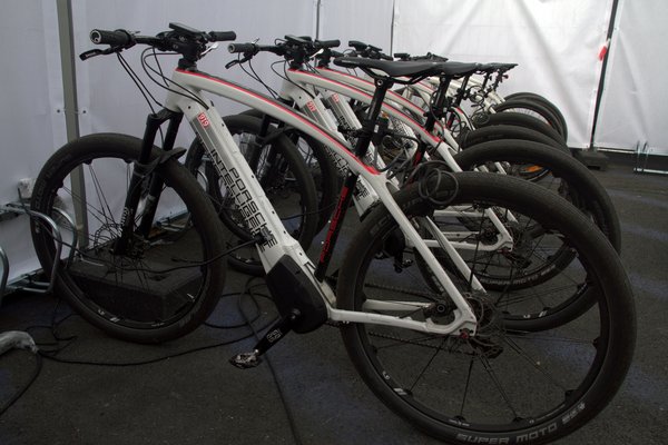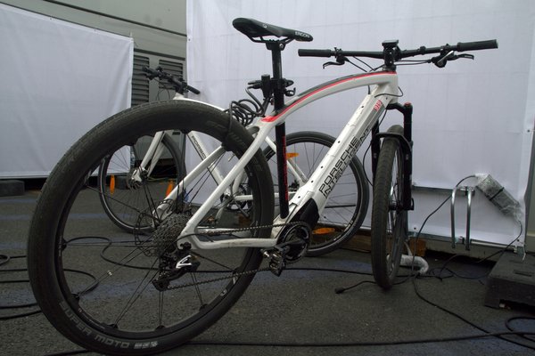 A Porsche bike-on a váz olyan, mint a Bike S-é (hidroformált alumínium), de DT Swiss OPM (One Piece Magnesium) első villával, kormányról állítható kompresszióállítással. A felnik is DT Swissek voltak, a fékszett Magura, a váltó Shimano Deore XT, TRS hajtókarokkal és egyéb nyalánkságokkal. Beárazni nagyon nehéz és mi tényleg csak saccolni mernénk, de ha abból indulunk ki, hogy egy mezei S ára 4490 euró és abban még nincs benne a rásegítő-rendszer és a villa, meg még ki tudja mi, akkor jóval több is lehet.