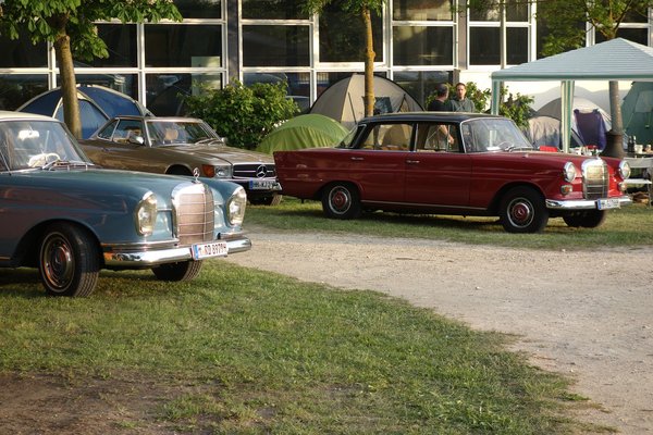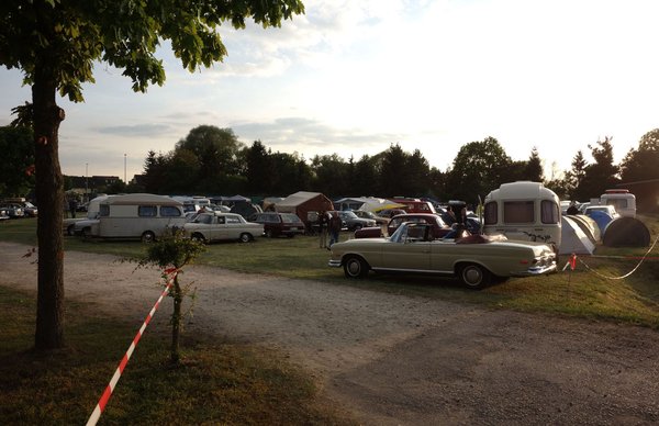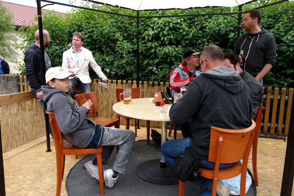 A magyar banda – voltunk bő harmincan – lezúdult a buszról és megcélozta A Sört. Régebben vicinálisabbak voltak az árak, ha jól rémlik, két euróért kapta az ember a VdH-Treffen (a klub neve teljességében kiélvezhetően: Verein der Heckflossenfreunde e.V./MB strichacht IG) korsót, utána egyért az utántöltést. Most bilétás és jelöletlen korsós lett a rendszer, ráadásul 2,50-et kérnek a sörért – az már nem annyira vicces. Azért nyeltük rendesen.