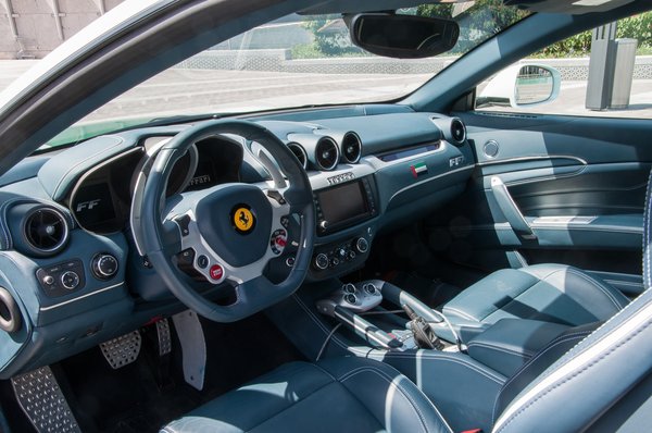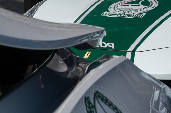 Reggel óta most először van időm rendesen megnézni – a Ferrarit, Majtából csak az arca látszik az amúgy ízléses egyenruhában – és még a gyártó többi kocsijával összehasonlítva is extrémnek hat. Nem is annyira a vonalai, hanem a shooting break kaszni teszi, pedig nem kelti aránytalan kombi benyomását. Az FF név a praktikumra utal – Ferrari Four -, vagyis arra, hogy négyüléses, és négykerék hajtású. Ezt a konkrét példányt még egy címeres plakettel is ellátta a Ferrari, az Emirátusok tiszteletére. Jellemző rendőri felszerelést kár is keresni, se cb-rádió, sem pedig monitor nincs az autókban, a sofőrök egymás közt kézi adóvevőkkel beszélgetnek.