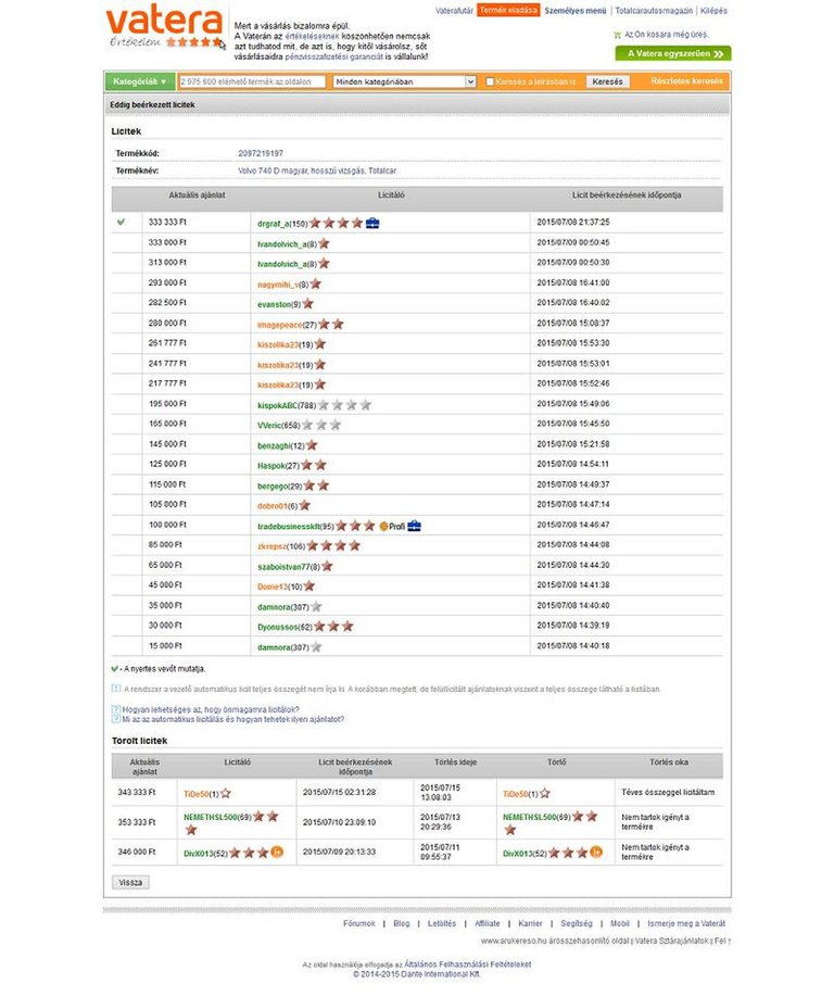 Meg ott voltak az izgulósok, akik tették rá a pénzt, anélkül hogy megfontolták volna, mit tesznek. Utána rájöttek, hogy jajjaj van, s csak úgy röpködtek a licittörlési kérelmek. Akkor minek licitáltak? Jog szerint nekem nem kellene elfogadnom az ilyet, és ha az aukció véget ér, a törvény kötelezi őket, hogy megvegyék a terméket, nincs vita. Persze nem akartam kicseszni senkivel, ezért törölgettem, de csak NEMETHSL500 volt korrekt, aki el is mondta, miért, s zsebből vállalta is a kiesett pluszt. A legcsúnyábban TiDe50 járt el, aki nem is licitálhatott volna, mert túl kevés minősítése volt hozzá, de direkt kért belépési engedélyt tőlem, hogy mégis. Utolsó nap szépen rá is pakolt az autóra, majd rá pár órára törlést kért. Ez mire volt jó? Megelőlegezem a bizalmat, ő rá is ugrik a lehetőségre, majd visszalép? Oké, kiderül, hogy valami közbejött, bárkivel történhet ilyen. De ő már a negyedik volt, ráadásul egy szót nem írt arról, miért, még annyit se bírt odaírni, bocsánat. Magyarország, udvariasság, kultúra, a másik fejével való gondolkodási képesség – na, ezek most már tényleg kezdenek a nullához tendálni, borzalmas erózió történt tíz-tizenöt év alatt, egyre bunkóbbak vagyunk és még büszkék is vagyunk rá.