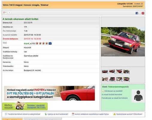 A Volvo aukciója olyan volt, mint egy kaotikus vaterás aukció némi trolloktól nyüzsgő Belsőség kommentablakba oltva. Jöttek a hőzöngők, hogy miért ennyi ez az autó, meg hogy látják, jó nagy üzletet csinálunk egy ilyen romból (ami egyébként nem igaz, mert többen van így is sokkal, mint az ára, de ez nem baj, mert ismerjük a világ menését, másrészt nekünk privátban egy büdös peták nem esik le a tranzakcióból, harmadrészt meg – ha tudnák, a Totalcar milyen költségvetéssel működik, meglepődnének. A pénzügyi részlegen ugyanis ez csak csepp a tengerben), meg hogy adjuk el az ő autóját is... Tudják, akik nem olvasnak, nem gondolkoznak, viszont élvezik, hogy publikus oldalon lehet hőzöngeni.