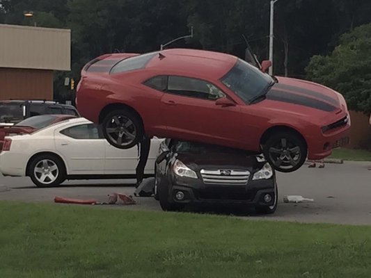 Minden bizonnyal élete legnagyobb meglepetése érte azt az autótulajdonost, aki egy Tennesse állambeli üzletből kilépve szembesült azzal, hogy Subaru Outbackjének tetején egy Chevrolet Camaro parkol.