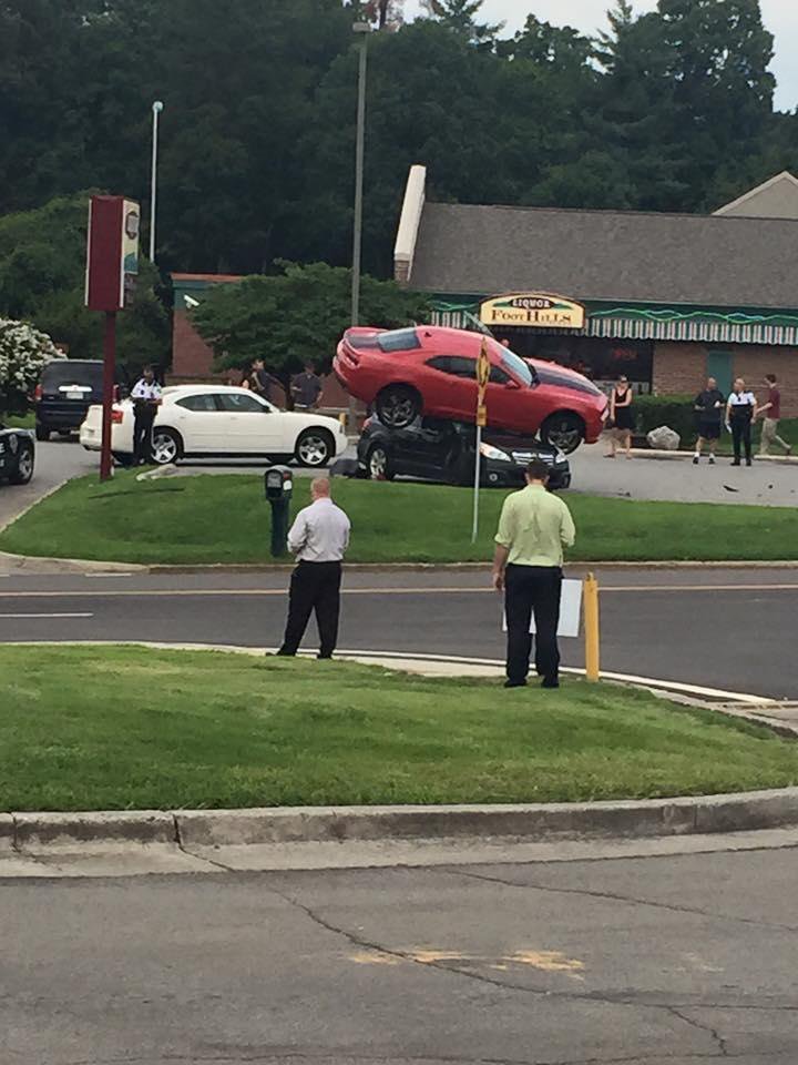 A napokban Maryville városában történt meg ez a furcsaság, méghozzá egy élelmiszerbolt parkolójában. Az áruház alkalmazottjai az eset után elmondták, látták a piros Camaro vezetőjét kikászálódni autójából, de nem látszott rajta, hogy megsérült volna. Azt viszont ők sem tudták megmondani, hogyan került a Chevy a japán kombi tetejére.