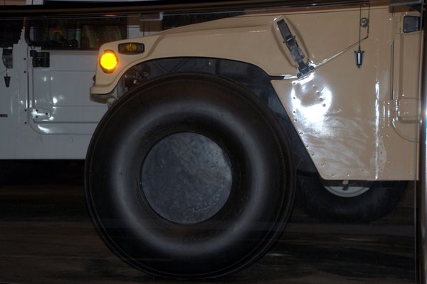 Az egyik Hummer a számtalan közül. Amiért érdekes, az a terepszög, vagyis annyira ballonos gumi került rá, hogy elméletileg a függőleges falon is képes felkaptatni, hiszen a kerék túllóg az első lökhárítón.