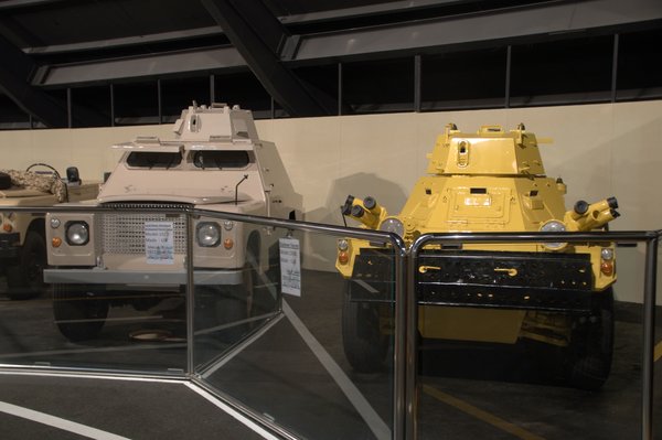 A sejk miért pont a rendfenntartó járművekhez ne vonzódna? Ezt a Land Rover Shorlandet a brit rendőrség használta a határok mentén a csempészet visszaszorítására. A páncélzat és a lövegtorony súlya miatt a felfüggesztését is megerősítették. Tőle jobbra a Daimler Ferret MK II páncélos jármű, amelytől a lövegtornyát kapta a Shoreland.
