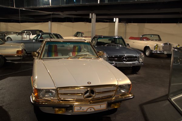Azt hiszem, ehhez nem kell különösebb kommentárt fűzni. Egy Mercedes 450 SL, szivárványszínű kárpitokkal, aranyozott díszlécekkel.
