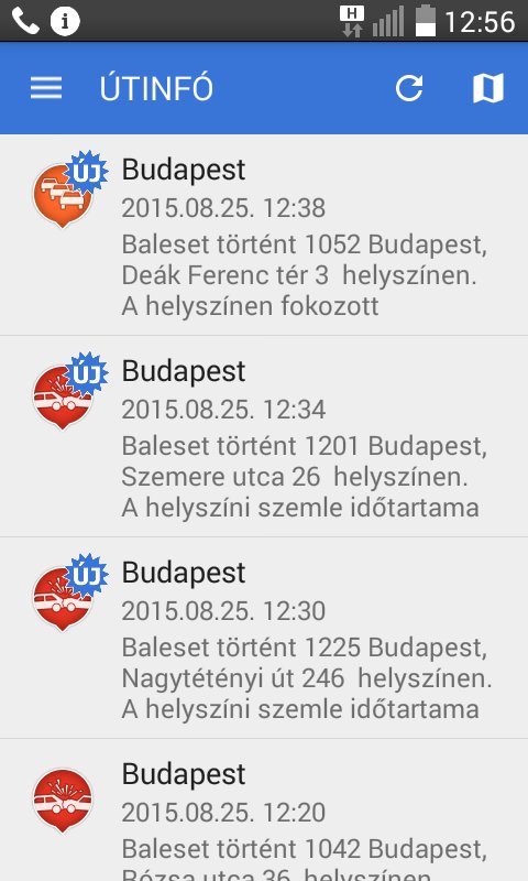 Ha a telefonon bekapcsoljuk a mobilnetet, néhány percenként frissülnek az adatok egy szöveges listáján, így bekerülnek az újabb balesetek is, sőt, a program által használt Google terképre feldobja a környék kerülőútvonalait. A lista helyett választhatunk kizárólag térképrészlettel ellátott nézetet is, amelyen elhalványulnak a helyeket jelölő piktogramok, ha levonultak a roncsok.