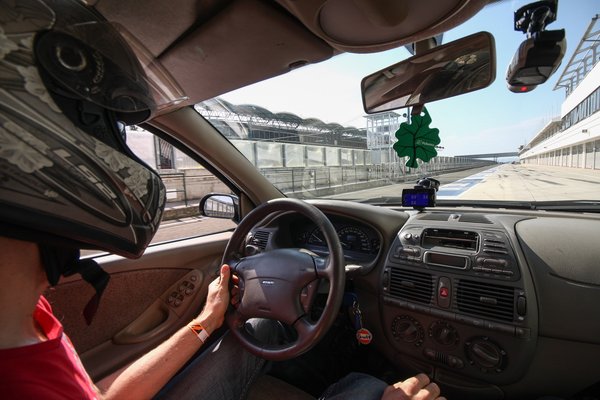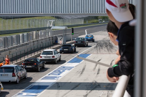 Két menetre regisztráltam, annyi közzel, hogy legyen idő szerelni. Úgy vonultunk ki, testületileg, hogy tudtuk, bármi megtörténhet. Felrobbanhat a motor, kigyulladhat a fék, tetőre tehetem a gépet, bár ennyire nem akartam feszegetni a határokat. A jó kis kínai Wanli-gumikkal nem is számítottam értelmes időeredményre, inkább néhány konzervatív kört szerettem volna letenni, hiszen itt most az a lényeg, mit tud az autó a vásárláskori állapotban.