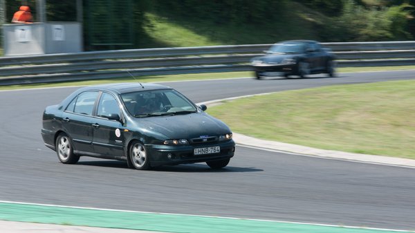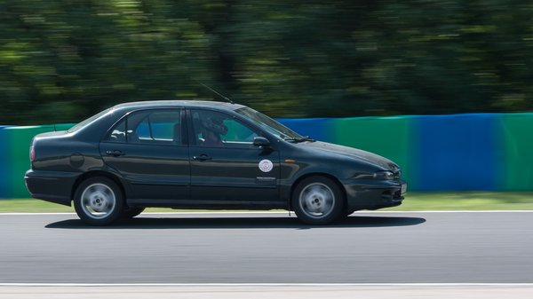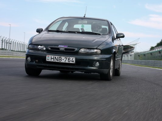 A Marea öthengerese egy titkos V8. Nem tudom, hogy jön ki belőle ilyen pokoli hangorkán, hiszen minden gyári rajta, de amikor a fordulatszámmérő mutatója belenyal a sebességmérő skálájába, megadom a 9,5-et a gépzajpontozásnál. Az első körben csak melegítgetem, ismerkedem a határaival, és elsőre nem is tűnik rossznak. A fékhez, amely közúton, két komolyabb lassítás után remegősre melegszik, hozzá lehet szokni – nyilván extra óvatos féktávokat veszek. A motorerőre eddig se volt panaszom, itt se tűnik kevésnek, érzésre megvan legalább 130 ló.