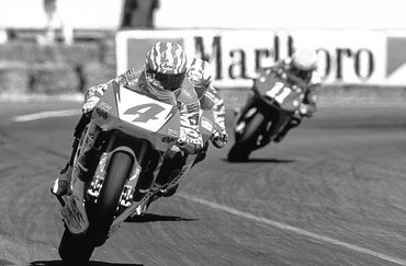 Mick Doohan vezeti az Egyesült Államok Nagydíját az 1994-es gyorsaságimotoros-vébén, szeptember 11-én. Mögötte az olasz Luca Cadalora, aki később megelőzte ausztrál riválisát. A pontversenyben azonban nem tudta megközelíteni sem Doohant. 143 pontos hátránnyal lett ezüstérmes (fotó: twitter).