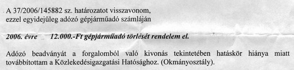 A szülők visszaküldték a levelet a feladónak, és csatoltak hozzá egy néhány soros magyarázatot is, amelyből újabb hivatalnok tudhatta meg, mi újság az autóval. János tegnap felhívta az adóosztályt, ahol barátságosan megemlítették neki, hogy elmulasztotta bemutatni nekik az autóval kapcsolatos legutóbbi kivonási határozatot, azt, amely 1998-tól 2008-ig szólt.