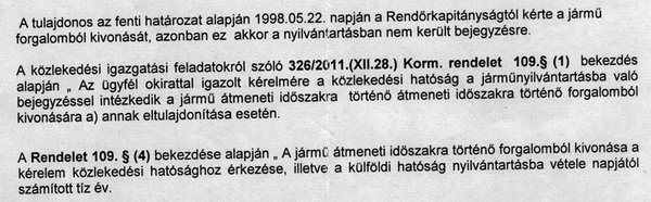 Miután elmondta, hogy az 1983-as Opelt ellopták és több határozat született már arról, hogy végleg ki kéne vonni a forgalomból, az ügyintéző mindezt úgy értelmezte, hogy az egykori tulajdonos nyilván ki akarja vonatni a forgalomból egy időre, ezért elindította az ideiglenes forgalomból történő kivonás nevű eljárást.
