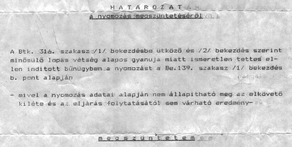 Később hivatalos határozatban kapott feloldozást ugyaninnen, hogy a Kadettet azért látják még mindig a rendszerben, mert a rendőrség a lopás után egyáltalán nem vonta ki a forgalomból, csak megírta Jánosnak, hogy már nem is nyomoznak.
