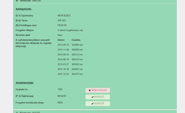 A bálna volt az érdekesebb, mert a papírjai szerint nem 1993-as (hogy mikor, azt a rendszer nem mondja meg, hiszen csak igen-nem viszonylatban kommunikál, üdv 2016-ban), ráadásul fekete és 300 SEL, nem 320 (ez már az évjáratból leszűrhető, mert későbbi nem lehetett, csak korábbi). Bumm, márpedig az az autó még a porréteg alatt sem volt fekete, nem 320-as, ahogy a nepper mondja és az évjárat sem okés. Forgalomban van és nem körözik, mondjuk ez már valami. Azt már nem is kommentáltuk, hogy 2014. augusztus 19-én egy nap alatt 50 ezer kilométert tolatott. Hívnám a neppert, hogy nézzen rá a forgalmira, de már nem veszi. Lélekben összetörtünk, Bandi becsukta a laptopot.