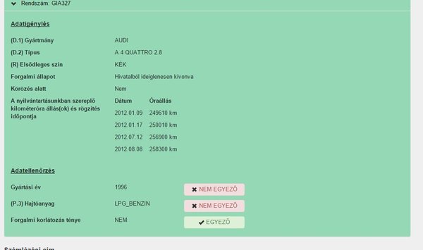 Az általunk tudott és bevitt adatok alapján gyorsan kiderült, hogy az A4-es simán benzinüzemű, a forgalmiban nincs benne a gáz (pedig hirdetve úgy volt), nem 96-os és ideiglenesen ki van vonva a forgalomból, magyarán vizsga nincs rajta.