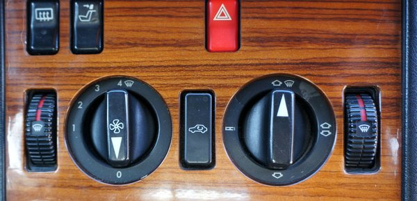 - Megdöbbenteni azonban az döbbentett meg a leginkább, hogy igen, ebben az autóban tényleg nem volt klíma, nélküle rendelték anno. Hihetetlen, de igaz, én sem láttam még ilyet, de most itt van. Teljesen más a fűtéskonzol, utánanézve találtam meg az infót, hogy bizony feláras volt akkoriban és jó eséllyel annyi pénzt elkértek érte, amennyinél olcsóbb volt, ha az ügyfél megrendelte az elektromos tetőablakot és a hővédő (zöld) üvegezést. Sofőroldali elektromos-memós ülés, fekete szövetkárpit, típusjelzés nélküli kivitel, tempomat és fényszórómosó-berendezés (azaz kis ablaktörlők), ennyi. Nem egy túlextrázott példány, de ennek csak örültem, hiszen rengeteg hibalehetőséget kizártunk ezzel. Persze maradt még bőven, de konkrétan most a klíma hiánya sem zavart, egy kicsit sem. Nincs ajtóbehúzó kis motorocska, hátsó motoros ülés sem. A hiperaranyos tolatópálcikák pedig működnek mint a kisangyal.