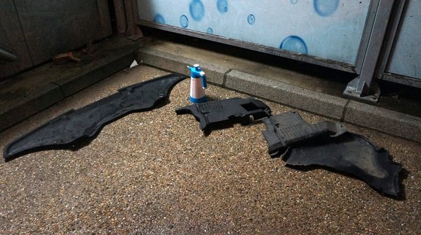 Megálltam még tankolni, mert gyanús volt a benzinszintjelző, ha már ott voltam, akkor adtam egy esélyt A dolognak. A dolog egy olyan univerzális tisztító lötty, amit Szigetszer Tomi adott azzal, hogy csodát tesz mindennel. Kárpitra nem javasolja, de az alumíniumot, műanyagot gyönyörűen takarítja, meg is mutatta saját Volvójának motorterét és tényleg elég jól nézett ki. Lepakoltam a koszos cuccokat a kézi mosóban és jól megküldtem a felrázott és hígított cuccal. Állítólag két perc után ajánlatos lemosni, ki is vártam, majd bedobtam két százast és nekiküldtem a lándzsát. Repült a rittyó mindenfelé, vizes lettem nyakig (mit bánom már, van fűtés), de az eredmény elég meggyőző. Az évek alatt bekühedt olajsarat úgy vitte le a vízsugár, mintha sosem lett volna. Na, így már mehetett egy doboz hátra, ezek pedig a beltérbe, nem koszoljuk össze a frissen kitakarított kárpitot.