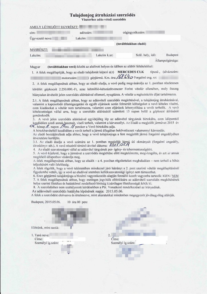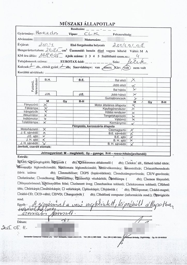 Ez embernyelven azt jelenti, hogy Péter olyan olcsón kapott egy tizenkét éves Mercedest, hogy nincs is joga reklamálni, ha a kocsi rossz, vagy kiderül, hogy visszatekerték a kilométerszámlálóját. Mivel egy éve közös cikket készítettem a német D.A.S Jogbiztosító szakjogászával, Dr. Vágány Tamással, most átismételtük a leckét. Megnézte az adásvételi szerződést és a kereskedő által emlegetett állapotlapot. Mivel valójában sem ezen, sem az adásvételin nem szerepel semmilyen megjegyzés az óratekerés gyanújára, vagy a CLK súlyos hibáira vonatkozóan, sőt, az állapotlapon minden műszaki paraméterhez a megfelelő jelzést ikszelték be, a helyzet egyszerűnek tűnik. Pedig nem az.