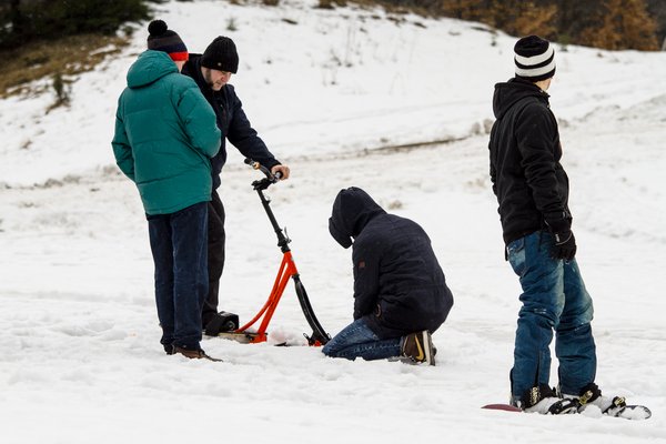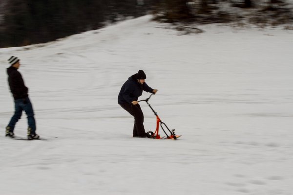 A jó azonban ebben az, hogy a sípálya tulajdonosa - Botond barátom – semmitől sem riad vissza és boldogan vágja hozzánk a motoros hószánt és ezt az izét, amit BikeBoard-nak hívnak. Nem néznék ki belőle, mekkora hatalmas móka és adrenalinfröccs. Pláne az első menet, melynél azt sem tudjuk, mikor mi fog történni.