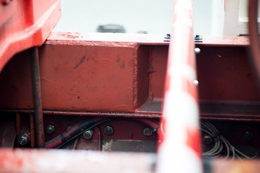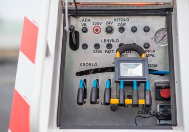 „Ezt jól kitaláltátok”, erősít a sztorira egy nagy darab, láthatósági ruhás illető, aki a szomszéd telephelyről jött át valamiért, de amúgy ritkán látja a szabadban a kamionmentőt. Csak egyetérteni tudok vele, tényleg jó kitalálták. Minden szétszedhető és összerakható, minden leszerelhető, akár egy másik autóra is átépíthető. Most így 10 tonnát tud emelni, tehát egy kamiont egészben is felvehetne. „Idő volt és van, úgy csináltuk meg, hogy minden porcikája precíz.” 20-as lemez a segédalváz, mind J2G3-as acéllemezből, és persze a hegesztődrót is a járműipari szabvány (SG3). A gémtestbe két hidraulika-munkahenger van beépítve, és nem csak úgy be vannak baszarintva a gumicsövek, hanem szépen megépítették a fém csőrendszert. Nem spóroltak a ledekkel sem; külön sor világítja meg a gémen a márkanevet, meg vannak világítva a szerszámosládák, van kivehető lámpa, inverter és 230 volt, földre állítható lámpa és mágnessel mindenhová feltapasztható tolatókamera. És hát elég sok itt a vas. A két milliméteres lemez még hagyján, abból vannak például a kerékívek, de a 15-ös és 20-as lemezeknél, melyekből a gém készült, már az anyagmozgatás sem volt egyszerű.