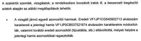 A nyomozásba bevont igazságügyi járműszakértő jelentése szerint a vázszámot meghamisították: az eredeti számjegyeket fémmel töltötték fel, és újakat ütöttek a helyükre. A lopott autó egy forgalomból 2010-ben kivont, németországi Renault Modus számait kapta meg, így honosították nálunk, amikor az első magyar tulajdonosa megvásárolta.