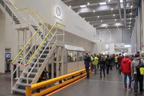A számoknál lenyűgözőbb a munkatempó, amivel a háztömbnyi gép dolgozik. Egyszerre akár hat szerszámmal tud egymást követő fázisokat elvégezni. Egy-egy csapással egy Golf/Leon/Octavia összes kerékjáratát meg tudja munkálni. Egyszerre készül a két első és a két hátsó doblemez, a prések között robotkarok pakolásszák a a munkadarabokat. De olyan szédítő tempóban, hogy azt a sebességet ember soha meg nem közelítheti – legalábbis nem sokáig lehetne végtagvesztés nélkül utánacsinálni a mutatványt. Épp csak elindul felfelé a présgép, mikor már nyúl be az egyik kar, rántja ki a kész munkadarabot, majd átfordul a következő préshez, precízen a helyére ejti az alkatrészt, és a roboter szemrebbenés nélkül, az utolsó pillanatban kirántja a karját a lecsapó présgép elől. A préssor végén emberek ellenőrzik a kész alkatrészeket, ők lényegesen tempósabban dolgoznak, mint az autók összeszerelését végző kollégáik.
