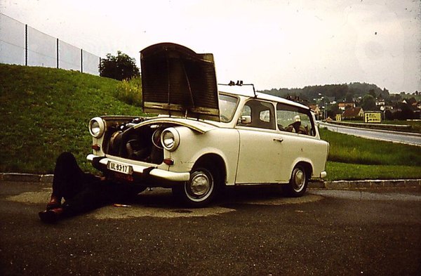 Még a Bartók Béla úti kockakövén lepottyant a belső tükör. Szigetelőszalaggal felragasztottam. A szombathelyi tankoláskor megszorult a kézifék huzalja, attól fogva fél kézzel a volánba kapaszkodva kellett kilógni az ajtón, és a padló alá vállig benyúlva megráncigálni a huzalt. Graz előtt ismerős hang riasztott: lelazult a dinamó, amely egyben a léghűtéses motor ventilátorának ékszíjfeszítője is. Kiállás az út szélére, javítás a sűrűn hulló esőben. Épeszű trabantos persze nem indul el komplett szerszámkészlet és csavaros doboz nélkül, csakhogy most az átlagosnál komolyabb a feladat: a dinamó két csavarja közül az egyik elveszett, a másik viszont beletörött az alumínium motoröntvénybe. Emelővel épp annyira lehetett felemelni az autót, hogy nyakatekert helyzetben, arc felett dolgozva, nagy nehezen hozzá lehessen férni. Háromnegyed órás munka volt kipiszkálni a beletörött darabot.