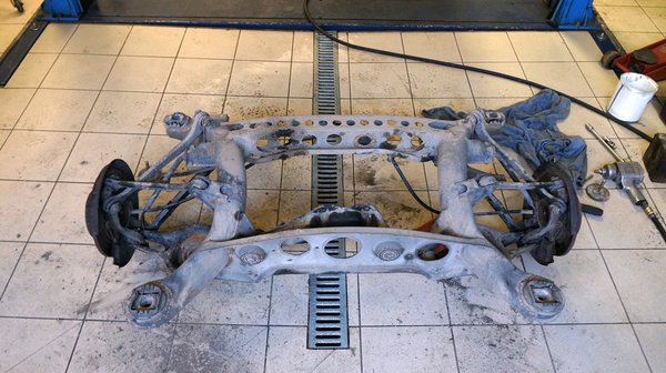 Elkezdtük lebontani a sallangokat, ahhoz, hogy leeresszük az egész hátsó bölcsőt. Minden cserélhető lett volna a helyén is, azonban így tiszta és könnyebben hozzáférhető minden, majd egyben vissza is húzható az autó alá. 25 éve mozdulatlan csavarokat hajtottunk ki, hullott a por és a szemét a fejünkre-arcunkba, de végül csak felemeltük az autót úgy, hogy az egész hátsó futómű a földön maradt. Az állapotok háborúsak (a rugók töröttek, vettünk bontottakat 5000 per darab áron, de csak a 320-asét szabad, hiszen súlyra adták meg a hozzávaló rugót) és kellőképpen siralmasak voltak már első ránézésre is. A megdöbbenés azonban csak ezek után következett.