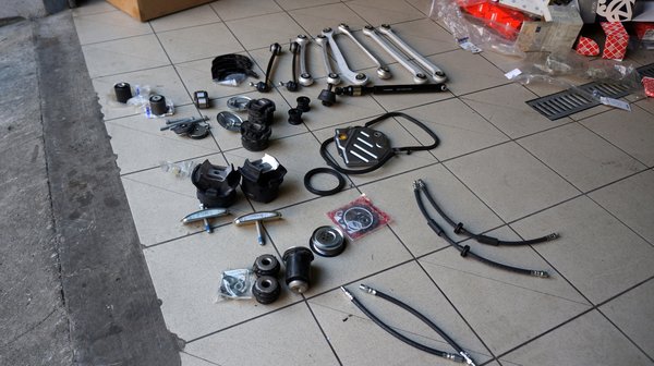 Aztán persze a Rulettkerék szerencsecsillaga ismét felragyogott: kiderült, hogy az ürömi Mercedes-bontó- és alkatrész-kereskedés is szívén viseli a sorsunkat, valamint elfekvőben, polcon akad náluk egy beragadt raktárkészlet, valamint vállalni tudják, hogy péntekre összeszednek mindent, ami kellhet. Czimbuláéktól végül egy 205 ezer forintos csomagot sikerült elhoznom, ebben benne volt minden, ami kellhet: az összes futómű-alkatrész, kivéve a gátlókat. Minden lengőkar, az összes szilent (bölcső- és difitartó, lengőkar- és ki tudja mi), a kazettás váltóolajszűrő a mosóolaj utánra, a kézifék-rugók és pofák (a kilincset és csavart Gábor kapta egy cimborájától), fékcsövek, a kormánylengéscsillapító, stb.